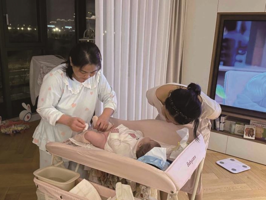 月嫂杨晓芳(左一)细心照看宝宝。