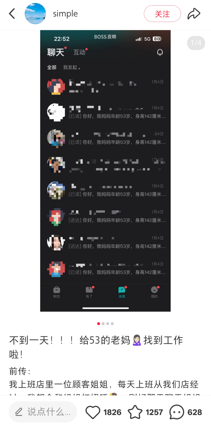 小简发帮妈妈找工作的帖子有很多人点赞评论,但她也提到需要警惕网上的求职骗局