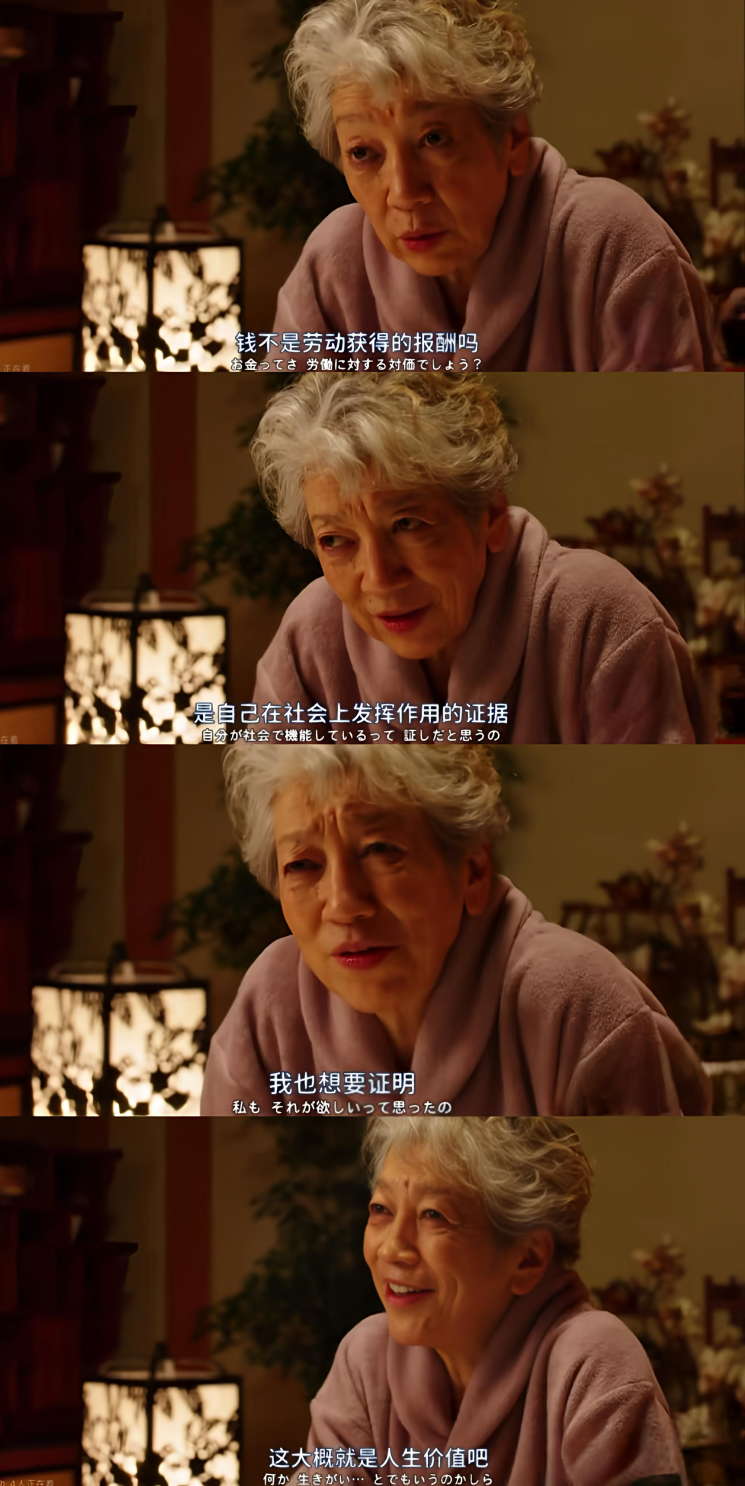 芹菜提到了日剧《三千日元的使用方法》,剧中77岁奶奶存款和理财利息已经可以覆盖日常支出,但还是希望通过工作证明自己的价值