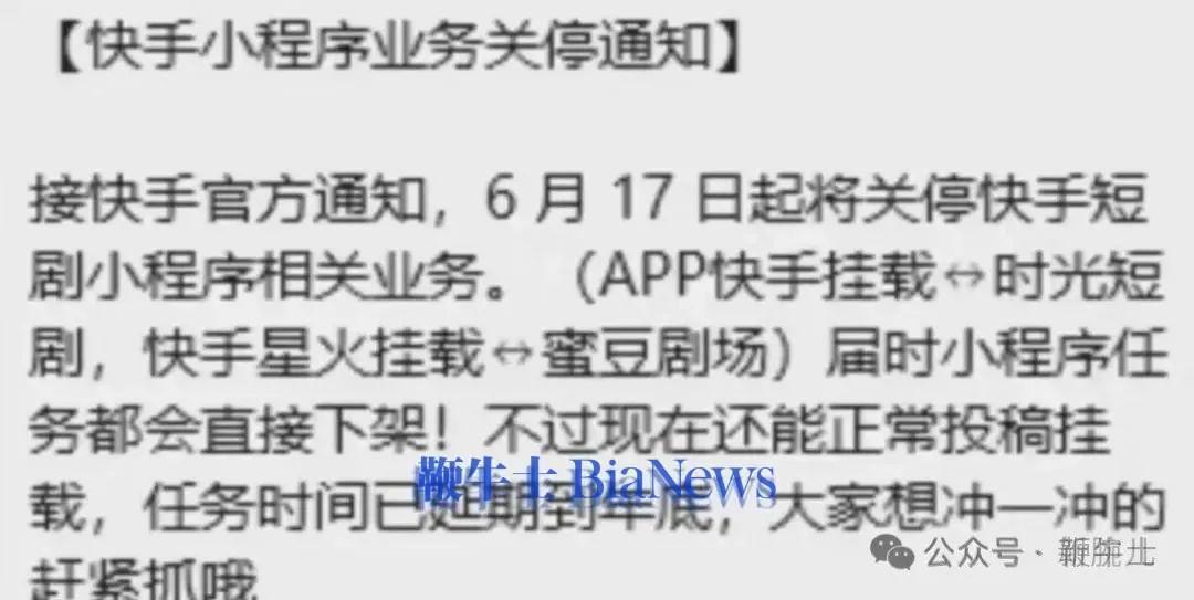 6月15日,据新腕儿短剧社群通知显示,快手将在6月17日关停短剧小程序相关业务,届时小程序任务都会直接下架。
