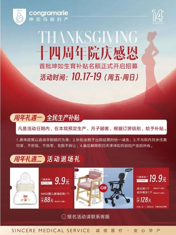 倒计时1天!温暖相伴十四载,感恩回馈正当时,坤如玛丽妇产医院14周年感恩游院会明天准时开启!这是一场专为您准备的感恩盛宴,我们已备好满满心意只待您的到来。022-58785533咨询报名