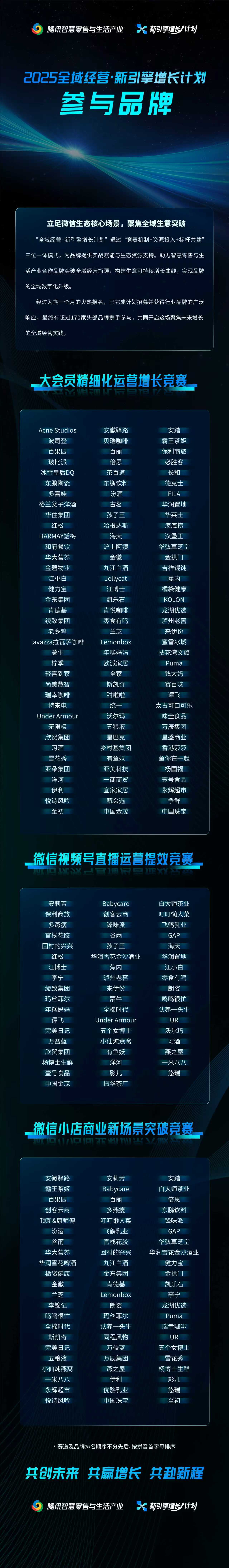 腾讯智慧零售与生活产业增长运营总经理梅婷表示:“经过为期一个月的火热报名,已完成计划招募并获得行业品牌的广泛响应,最终有超过170家头部品牌携手参与,覆盖零售、文旅酒店、农业、建筑等领域。我们希望通过全域经营 新引擎增长计划,与参赛品牌共同开启这场聚焦未来增长的全域经营实践。”